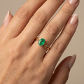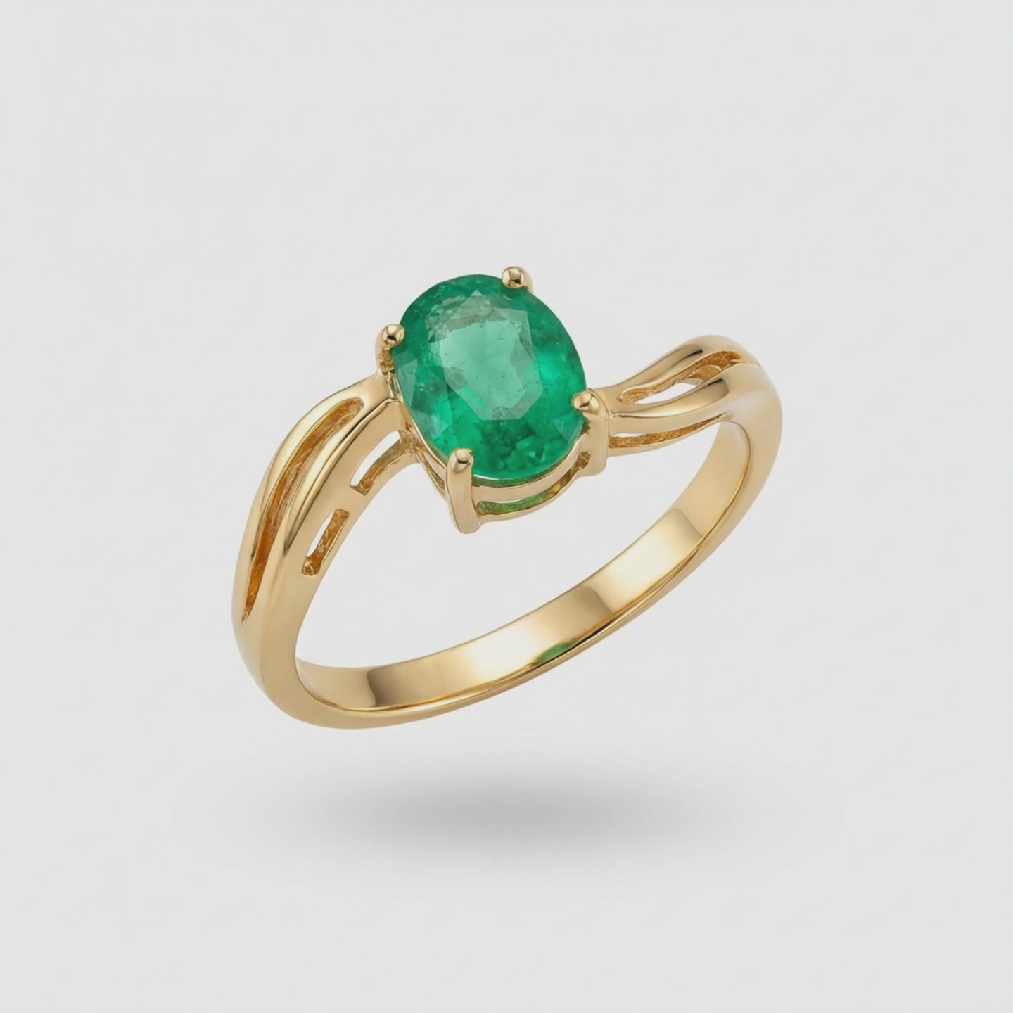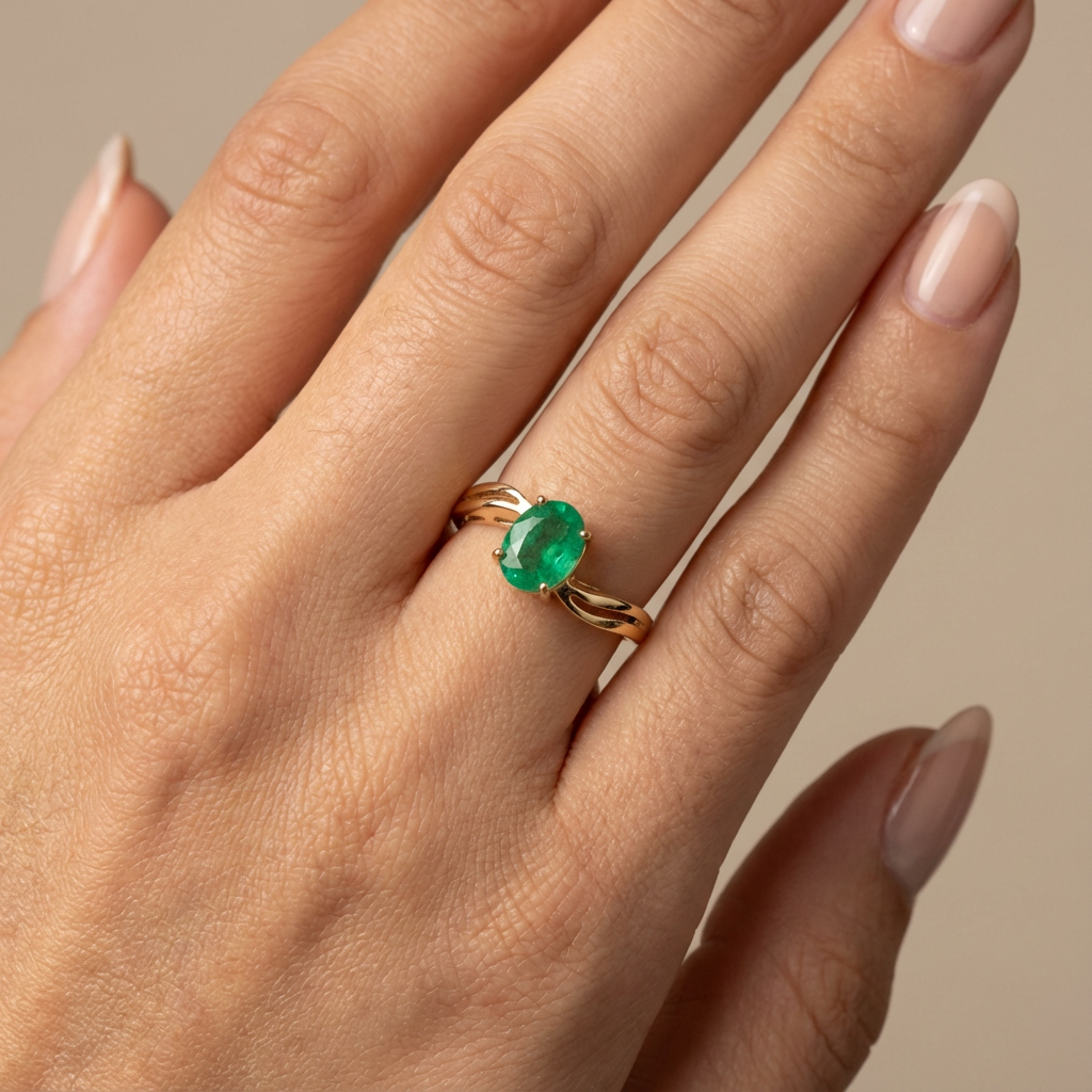 Anillo elaborado en oro amarillo 18K, protagonizado por una esmeralda natural de corte oval, engastada en garras que realzan su intensidad de color y permiten una óptima entrada de luz. El diseño del aro presenta líneas suaves y abiertas en los laterales, aportando elegancia, ligereza visual y un carácter contemporáneo con acabado artesanal.