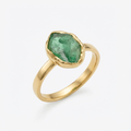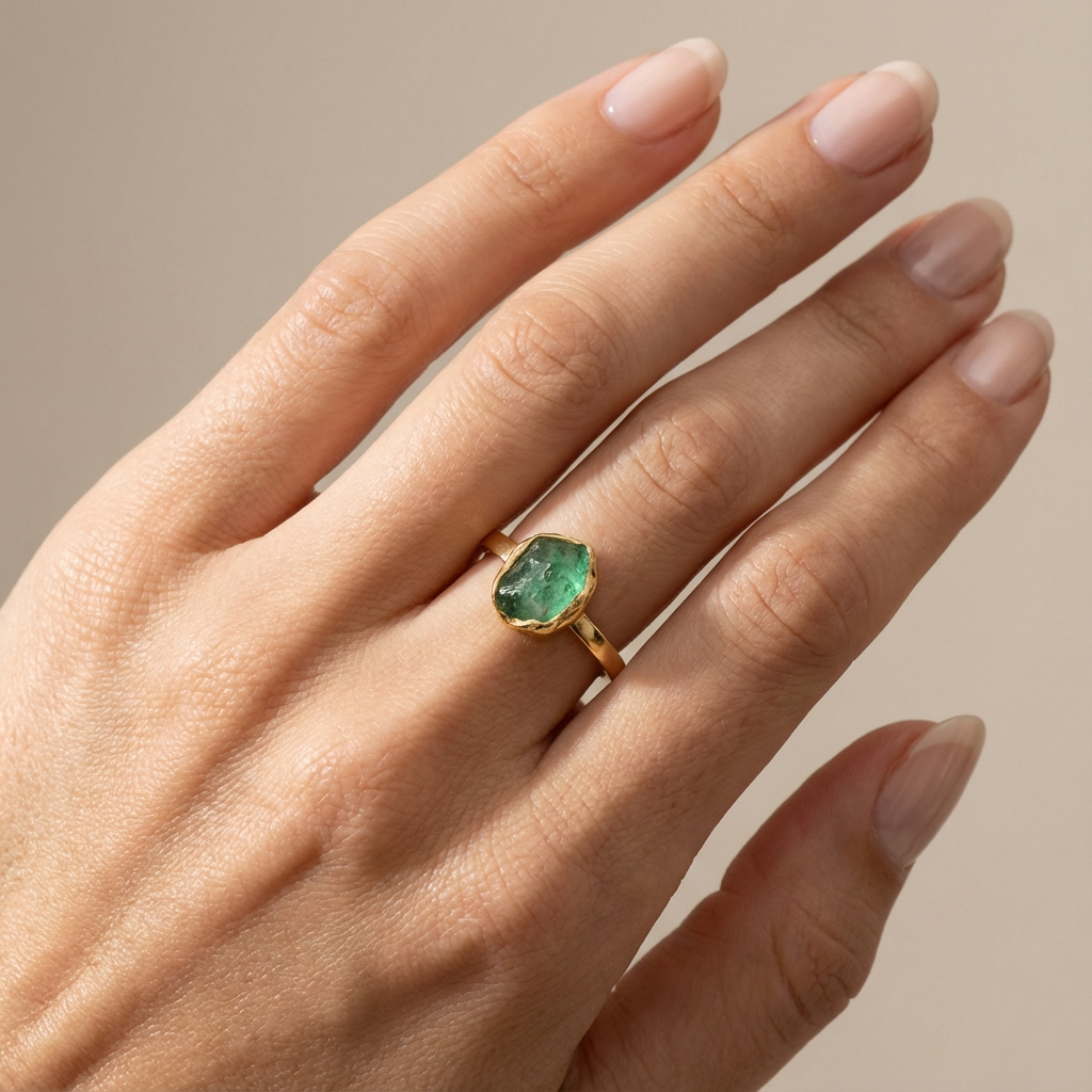 Anillo elaborado en oro amarillo 18K, protagonizado por una esmeralda natural rústica de corte irregular, que conserva su esencia orgánica y auténtica. La piedra está enmarcada por un engaste artesanal de acabado irregular, resaltando la belleza natural de la esmeralda y convirtiendo cada pieza en única e irrepetible. Un diseño con carácter, ideal para quienes valoran la joyería con identidad y origen.