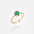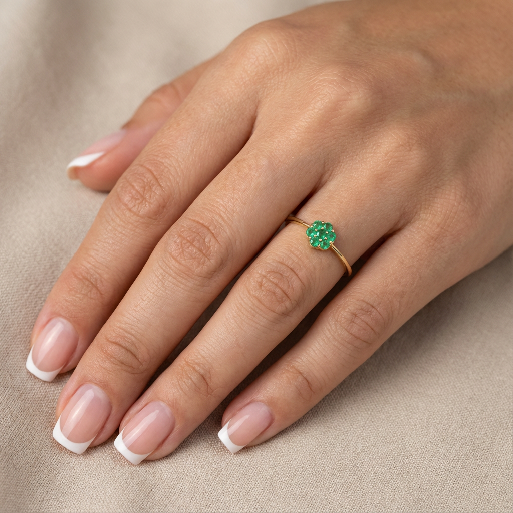Anillo elegante y femenino elaborado en oro amarillo 18K, con un delicado diseño tipo flor compuesto por esmeraldas naturales cuidadosamente engastadas. Una pieza clásica con un toque romántico, ideal para uso diario o como regalo especial.