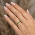Anillo tipo media alianza elaborado en oro amarillo 18K, engastado con esmeraldas naturales dispuestas de forma continua que aportan un brillo verde elegante y equilibrado. Su diseño delgado y refinado lo convierte en una pieza ideal para uso diario, combinar con otros anillos o como complemento perfecto para anillos de compromiso.