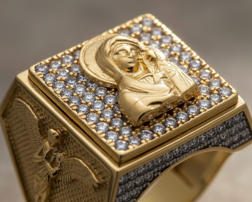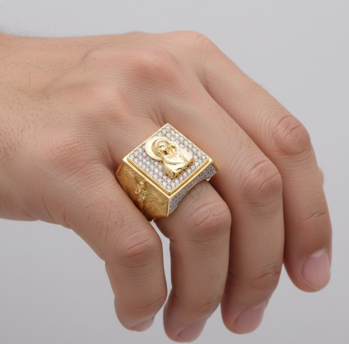 Fabricado en Colombia bajo los más altos estándares de calidad, este anillo representa una fusión entre arte religioso y joyería de lujo, pensado para quienes buscan portar su fe con distinción y elegancia.