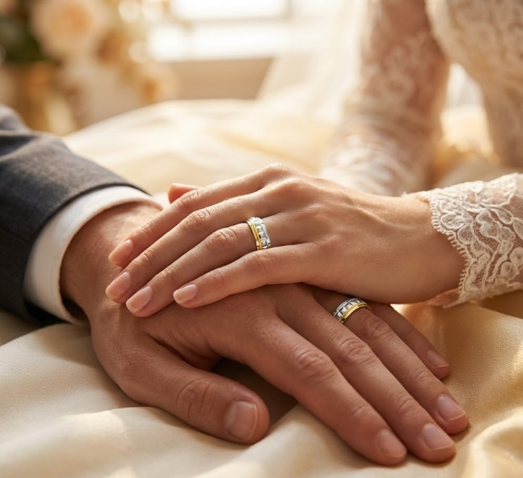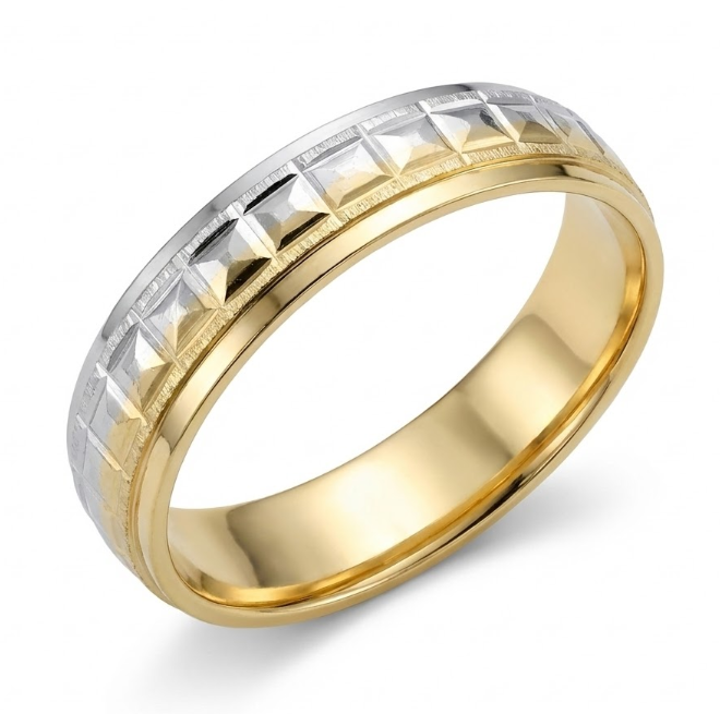 Estas argollas de matrimonio combinan oro amarillo 18k y oro blanco 18k en un diseño bicolor elegante y moderno. El acabado diamantado geométrico crea un brillo intenso y facetado que resalta en cada movimiento, logrando una pieza llamativa pero sofisticada.