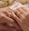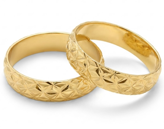 Estas Argollas de Matrimonio en Oro Amarillo 18k destacan por su acabado diamantado geométrico, un patrón que aporta un brillo único y una textura de lujo que no pasa desapercibida.