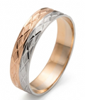 Estas Argollas de Matrimonio en Oro Rosado y Blanco 18k combinan armoniosamente dos tonos de oro en un diseño moderno y elegante. Su acabado diamantado crea un efecto brillante que resalta el contraste entre los colores y añade un toque de lujo artesanal.