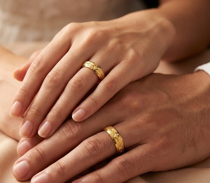 Estas argollas de matrimonio en oro amarillo 18k cuentan con un diseño único y simbólico: un corazón central acompañado de una línea de latido (EKG) tallados artesanalmente sobre el anillo. Un modelo que representa conexión, vida y unión, ideal para parejas que desean una argolla con significado profundo y un estilo distintivo.