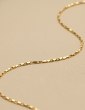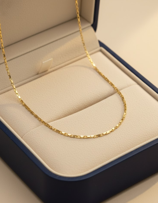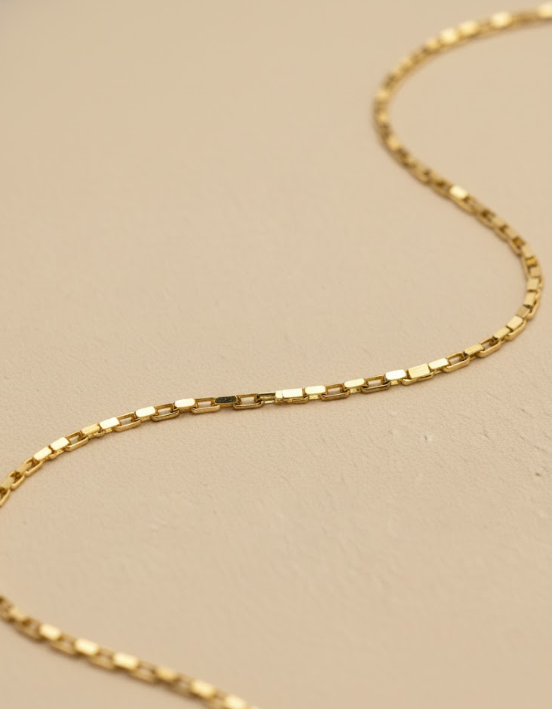 Su estructura de eslabones rectangulares finamente pulidos proporciona una apariencia uniforme y brillante, ideal para combinar con dijes delicados o usar sola como pieza esencial.