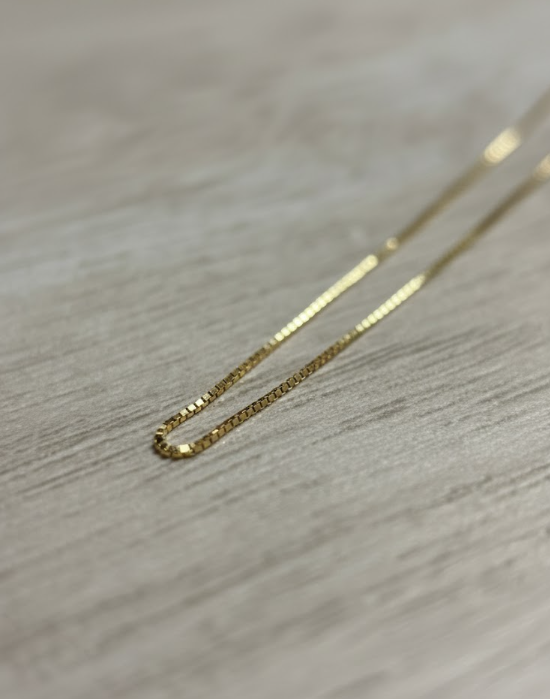 Fabricada con eslabones cuadrados minuciosamente pulidos, esta cadena refleja un brillo uniforme y elegante, característico de la joyería italiana de alta precisión.